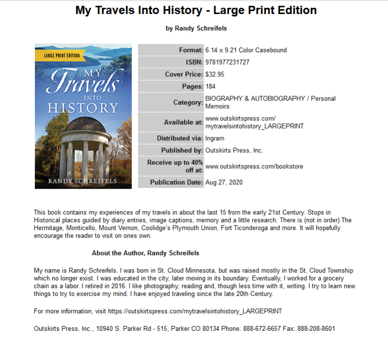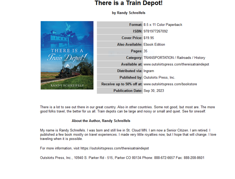 Randy Schreifels randylsauthor.com Hi I am Randy. I wrote 5 books. They are far from Best Sellers. But lower income folks can afford them. They are under $18. There is "From The Train" A pictorial with captioned images, as you guest shot from the train. Not professional quality, but good composition. That tells a lot. 42 images. About 42 pages. There is "My Travels into History." This book experiences my travels in abut a 15 year period. Places like Mount Vernon. Hermitage & Monticello, Springfield, Illinois, Gettysburg and more. This come also in Large Print. There is "My Adventures at Jay Cooke" Of my hikes on the four days I was at this state park in my home state of Minnesota. My challenge of keeping only one color image per day. 48 pages, 32 images. There is "Simply Short Stories" Stories inspired from life and stories from the imagination for your reading delight! Six stories 48 pages. There is "There is a Train Depot!" a pictorial. 30 images of almost that my depots across the country.